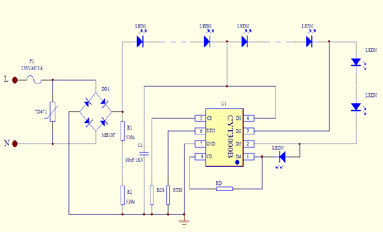 CYT3000B具有输入功率自动调节的功能,当输入电压过高时,将降低输出电流,电流降低的幅度通过外置电阻RD设置,以此保证输入功率不随输入电压变化。可以实现AC180V至AC300V输入电压变化范围下,输入功率变化在5%以内。