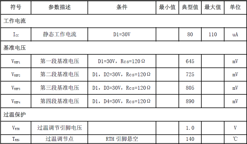 注1:极限参数值是指超出该工作范围,芯片有可能损坏。推荐工作范围是指在该范围内,器件功能正常,但并不完全保证满足个别性能指标。电气参数定义了器件在工作范围内并且在保证特定性能指标的测试条件下的直流和交流电参数规范。对于未给定上下限值的参数,该规范不予保证其精度,但其典型值合理反映了器件性能。注2:温度升高zd功耗一定会减小,这也是由TJMAX, θJA,和环境温度TA 所决定的。