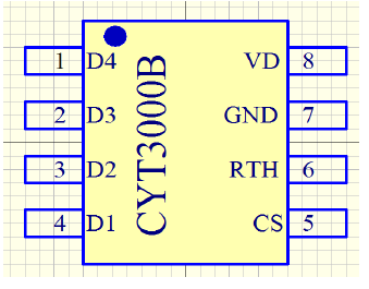 CYT3000B具有输出电流随温度自动调节的功能。当温度过高系统将降低输出电流,以达到降低温度的效果,温度保护点可以通过引脚RTH端的外置电阻进行设置。